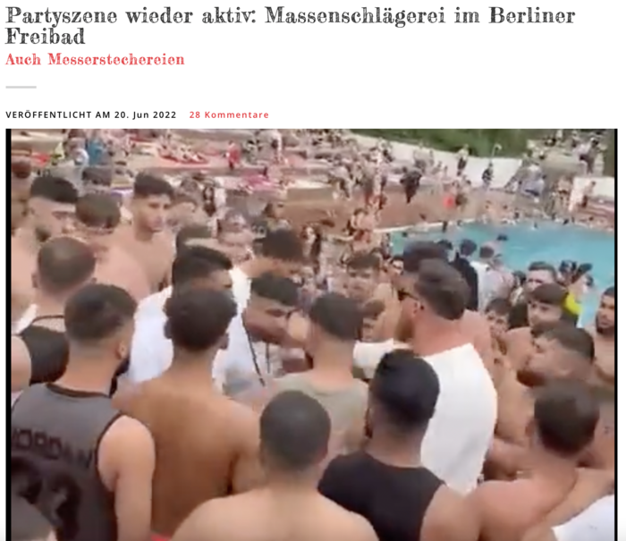 Ansonsten empfehle ich Ihnen noch ganz aktuell meinen Beitrag zur „Partyszene“ in einem Berliner Freibad – einer Massenschlägerei mit Messerstichen. Ein erboster Kommentator schrieb mir dazu auf Gettr, das habe es doch auch schon vor 50 Jahren gegeben, es ginge mir doch nur um Klicks. Genau diese Realitätsverweigerung, kombiniert mit Diffamierung, ist eine der Hauptursachen für die Missstände in unserem Land. Ein Bademeister hat mir schon vor ein paar Jahren sein Leid geklagt über die ständig wachsende Aggression – aber für die Kulturkrieger, die die Mehrheit der Menschen in unserem Land umzuerziehen und einen besseren Menschen schaffen wollen wie einst Lenin & Co., sind solche Realitäten natürlich „böse“ bzw. „Nazi“.